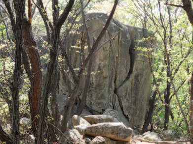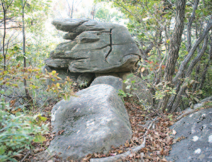 그대로 100m 정도 걸어 능선에 올라 방향을 왼쪽 으로 바꾸어 200m 가량 가면 거대한 바위지대 쉼터다. 길은 바위 좌우 두 갈래지만 어느 쪽으로 가도 마찬가지다.