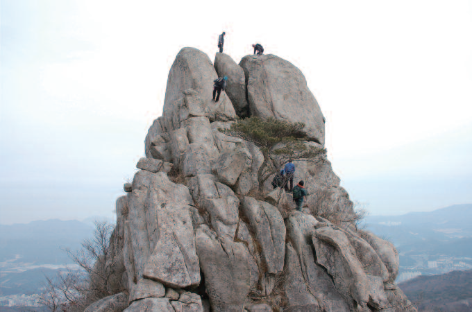 무명암 위의 바위능선은 금정산이 자랑하는 무명암리지다. 길이는 약 500m로 비교적 짧은 편이지만 회동저수지와 부산 시내를 한 눈에 내려다 볼 수 있어 전망이 그만이다.