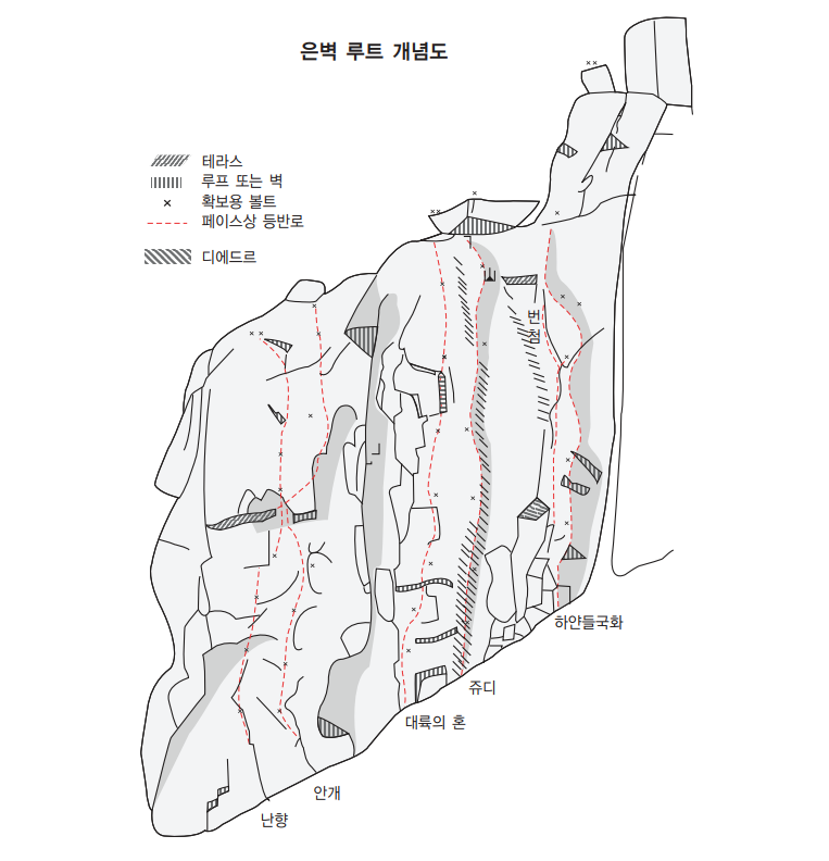 필요장비 40m 로프 2동(티롤리안 브리지를 하지 않을 경우 로프 1동) 퀵드로 5개 프랜드 반세트 슬링 2개 줄사다리 3개 <사람과산 2006년 6월호 200호 별책부록>.