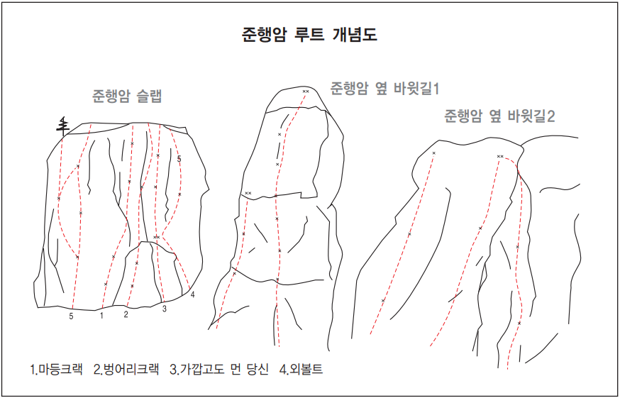 금정산의 암벽코스들은 산성 북문산장에서 조금 떨어진 곳에 있는 준행암을 시작으로 산성을 따라 남문 쪽으로 가다보면 은벽 무명암 나비암 부채바위 동자바위 대륙암 칠성암이 차례로 나타난다. 대암벽이라고 할 만한 큰 바위벽은 아니지만 아기자기한 이들 바위 모두가 바로 부산 클라이머들의 모암(母巖)이다.