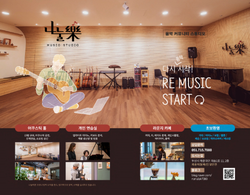 음악으로 나누는 커뮤니티 스튜디오 나눌락은 재송동-센텀 지역에 위치한 문화복합공간으로 연주자들의 호평을 받는 어쿠스틱홀, 아늑하고 깨끗한 연습실, 다양한 음료를 맛볼 수 있는 카페, 편히 쉴 수 있는 분위기 좋은 라운지로 구성되어 있으며, 200여명의 회원들을 주축으로 매년 다양한 교육 프로그램, 공연, 봉사, 출판, 커뮤니티 행사를 진행합니다.
