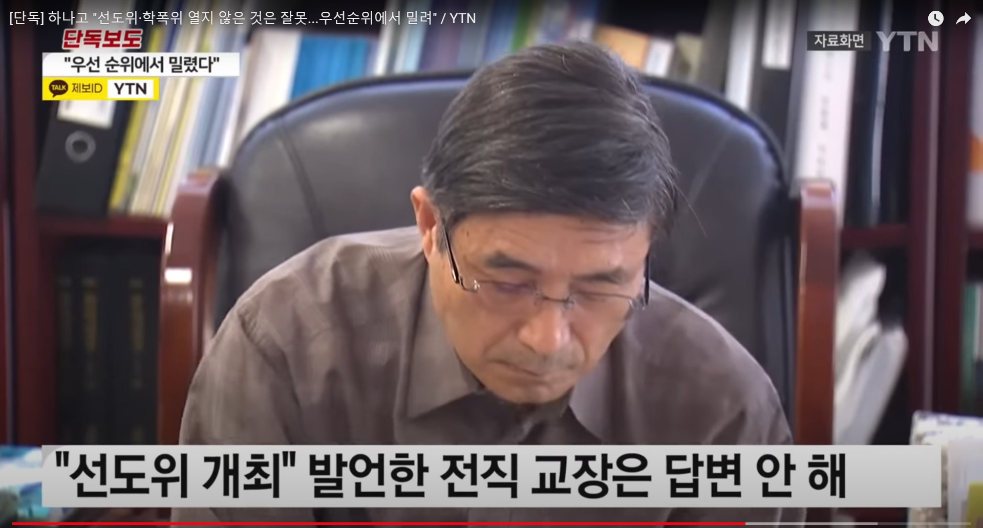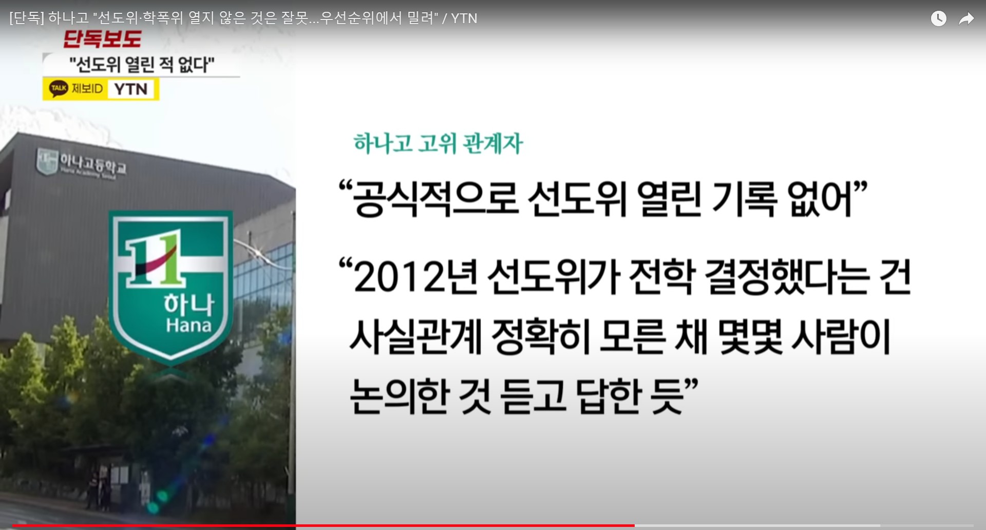 현직 하나고 고위 관계자는 YTN 취재진에게 선도위원회는 공식적으로 접수하고 여는데 그런 게 없었던 거 같다면서 사실관계를 정확히 몰라서 몇몇 사람이 논의한 것을 듣고 당시 교장이 그렇게 답하지 않았을까 싶다고 설명했습니다.