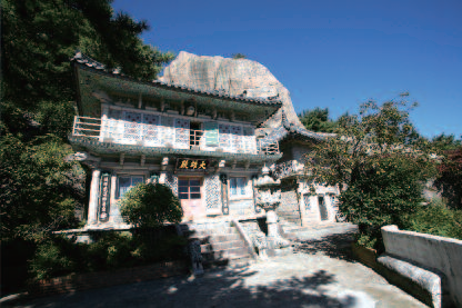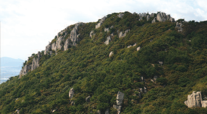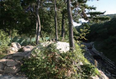절을 둘러보고 나와 다시 능선에 올라서면 길이 패어 능선에 고랑을 파놓은 듯 하다. 마사토로 된 능선에 사람이 많이 다니다 보니 다져져 낮아진 곳에 물이 흐르기 시작하면서 흙과 모래가 씻겨 내려가 능선의 큰 나무들이 뿌리를 드러내고 있다. 작은 개울처럼 패인 곳을 이리저리 피하면서 10여 분을 오르면 사방이 확 트이는 바위지대가 펼쳐진다. 이곳의 바위들은 아래의 병풍암(屛風嵒)과 맥을 같이 하는 듯 모두가 우람하고 시원시원하다.