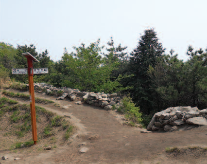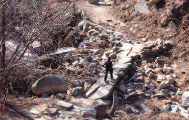 등산로에 들어서면 오른쪽에 계곡을 두고 밋밋한 오름이 시작된다. 3~4분 후에는 계곡을 건넌다. 최근 에는 여간해서 볼 수 없는 오래된 돌다리지만 대부분의 사람은 무심코 그냥 지나친다. 다리 건너 된비알에 나무계단을 설치해 놓았다. 10여분 오르면 금정고개로 연결된 등산로와 만나는 갈림길에 이정표도 서있다. 남문까지 1.1km다.