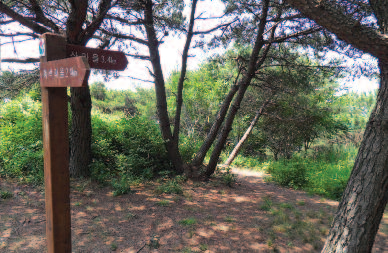 삼거리에서 왼편으로 4분이면 정자 쉼터를 만나고 다시 7분이면 두 번째 정자쉼터가 나온다. 그대로 산자락을 100여m 돌아가면 오른편에 계단으로 된 들머리가 보인다. 전체 40분이면 넉넉하다.