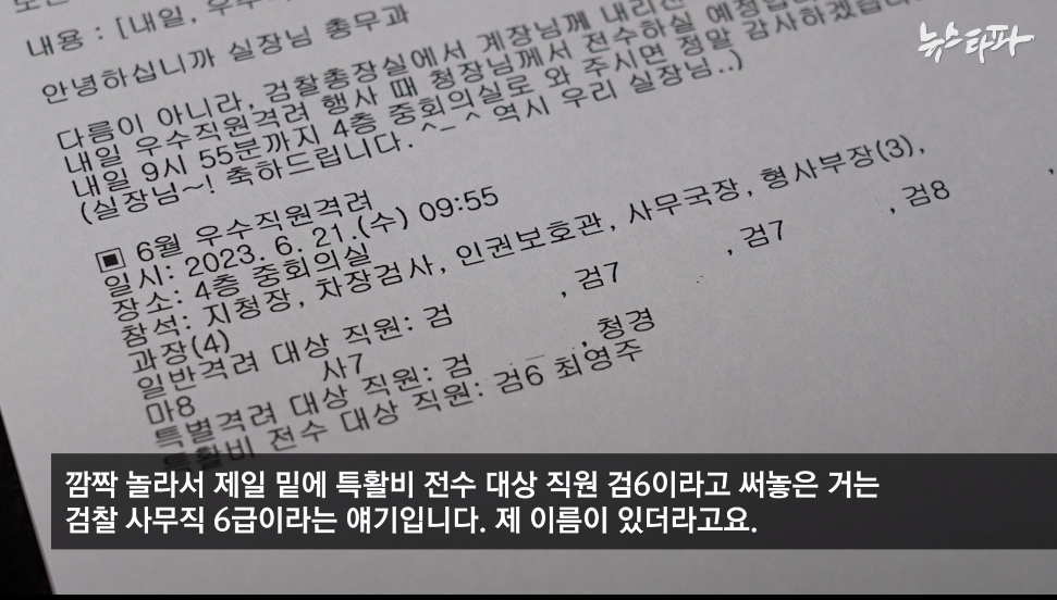지난해 6월 20일 오후 1시 5분. 검찰 내부 통신망인 이프로스에 대전지검 천안지청 최영주 민원실장 앞으로 메시지가 도착했다. 천안지청 총무과 동료 직원이 보낸 것. 제목은 “내일 우수직원 격려 행사 참석 안내”였다. 자신이 우수 직원으로 선정돼 검찰총장으로부터 특수활동비 100만 원을 받게 됐다는 것이다. 총무과 직원의 표현을 그대로 하자면, “검찰총장실에서 계장님께 내리신 특활비 100만원”을 내일, 우수직원 격려 행사 때 “(지)청장님께서 전수하실 예정”이라고 했다.