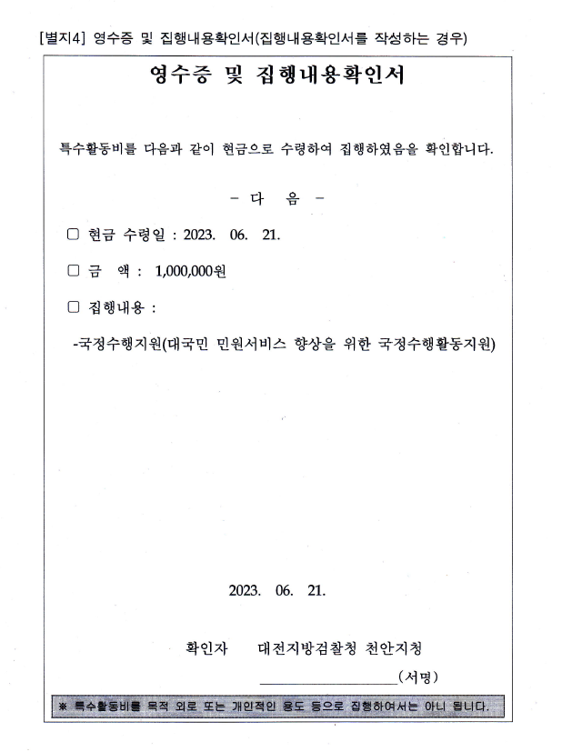 ▲ 최영주 전 천안지청 민원실장이 받은 특활비 영수증. 집행 내용에 민원 서비스 향상을 위해 특활비를 집행한다고 적혀 있다.