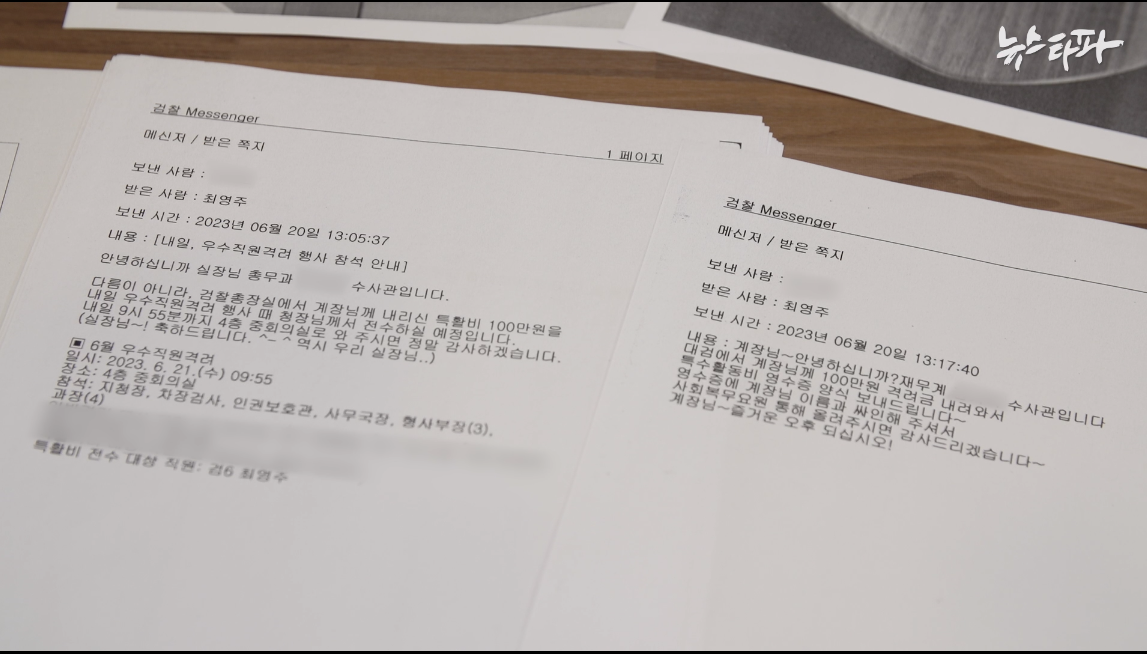총무과 직원의 메신지를 받고 몇 분 뒤, 이번엔 천안지청 재무 담당자의 메시지가 왔다. 대검찰청에서 100만 원의 격려금이 내려왔으니 특수활동비 영수증에 서명해 보내달라는 요청이었다.