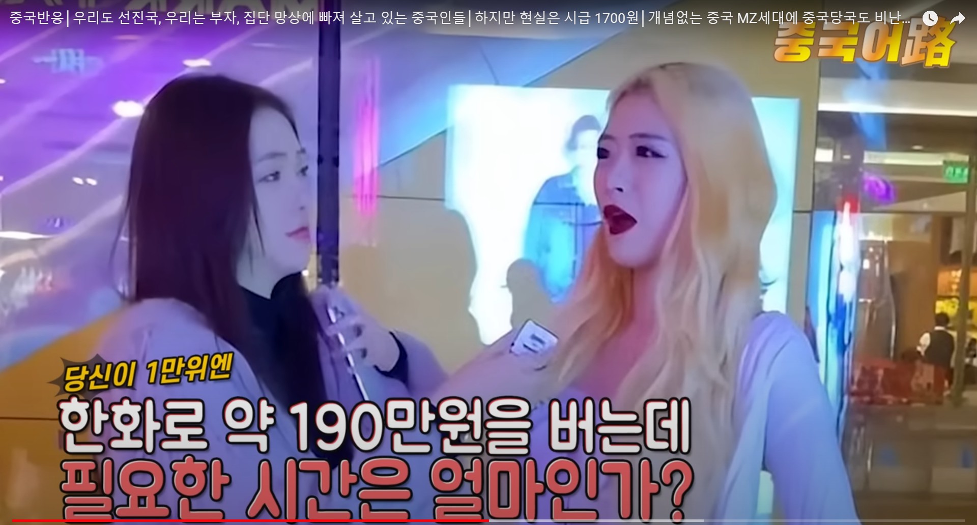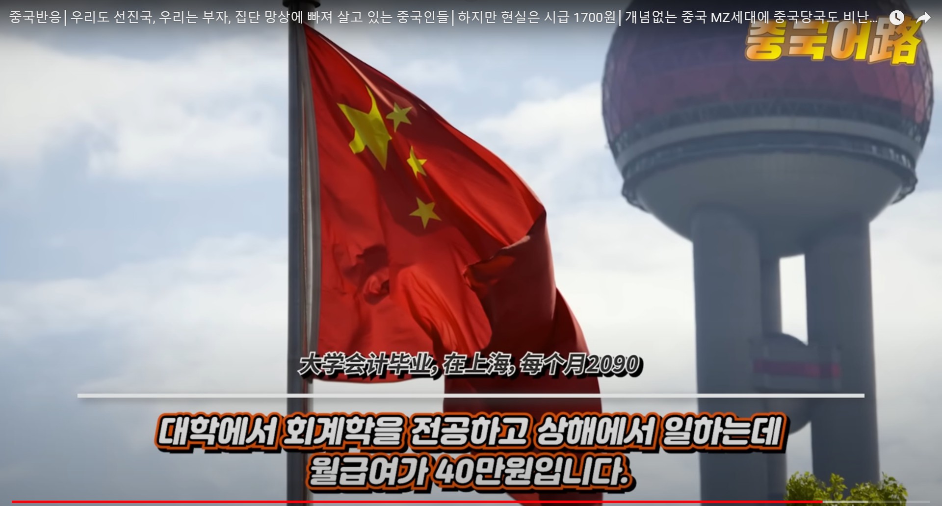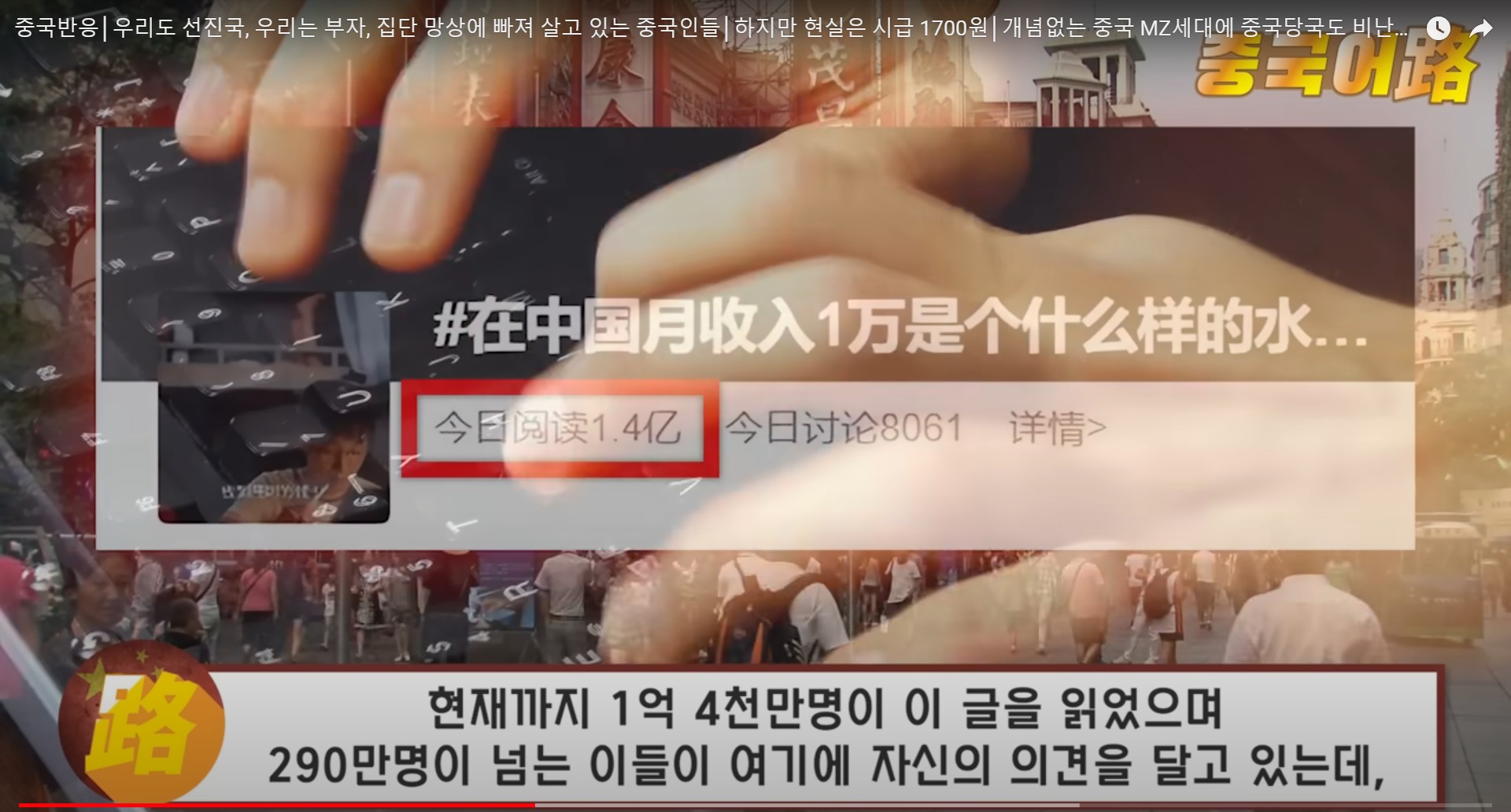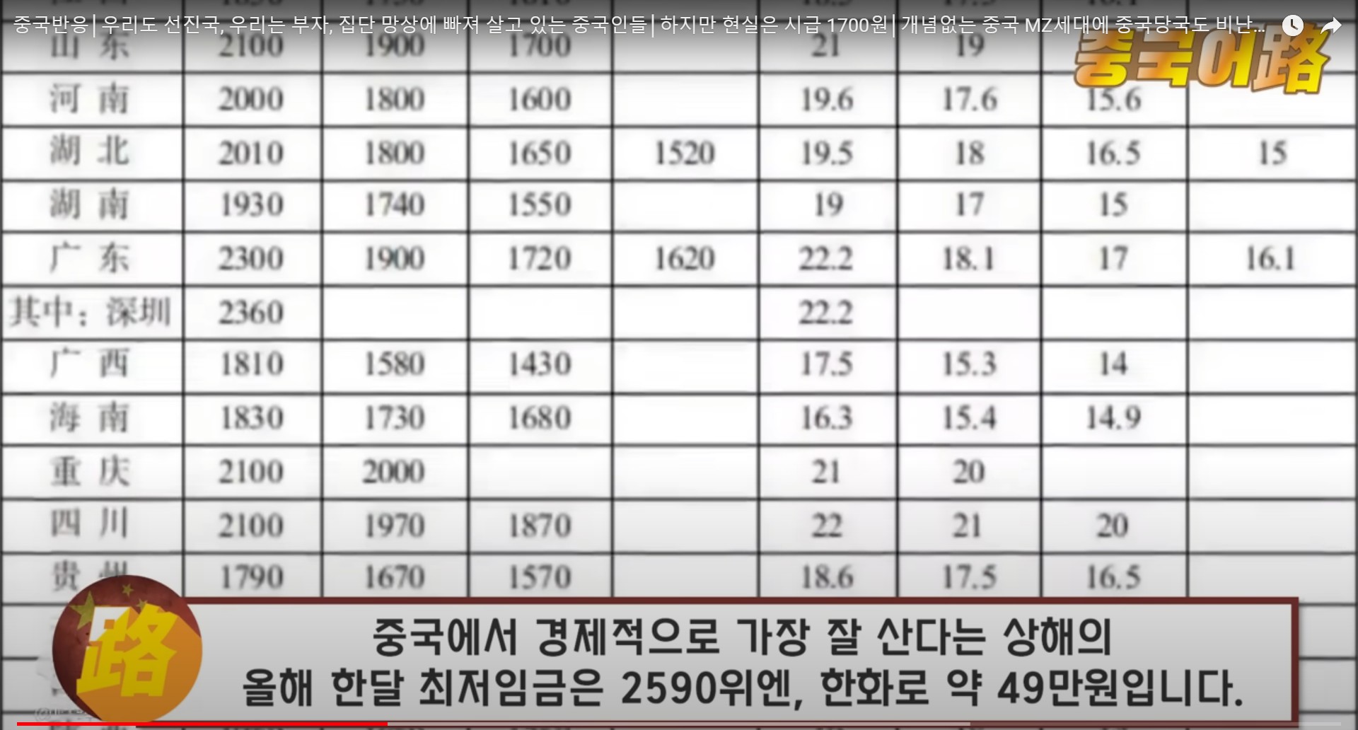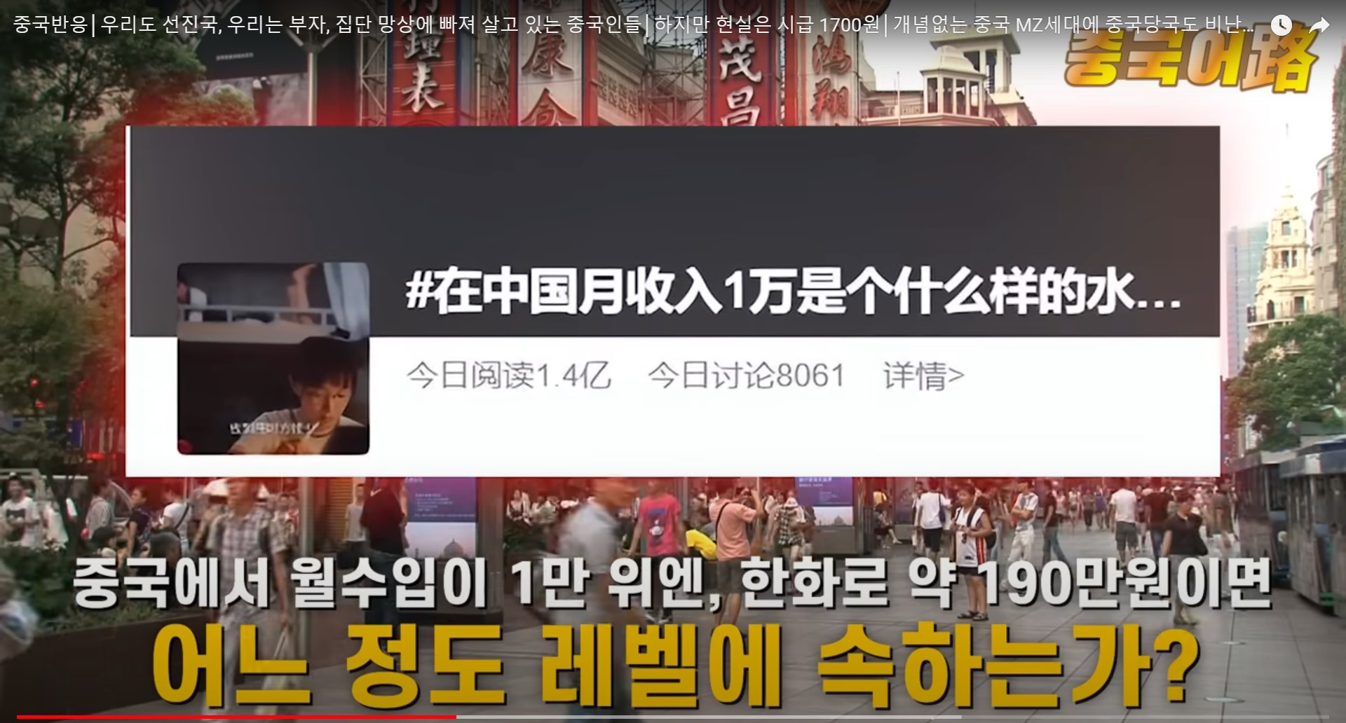 ‘중국에서 월수입이 1만위안, 한화로 약190만원이면 어느 정도 레벨에 속하는가?’ 라는 주제입니다.