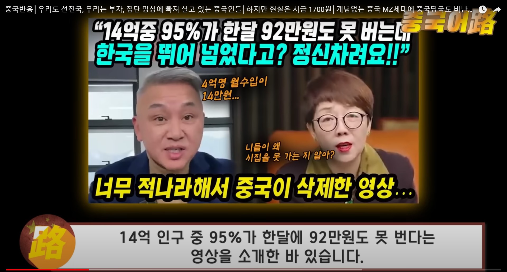중국 14억 인구 중 95%가 한달에 92만원도 못 번다는 영상을 소개한 바 있습니다.