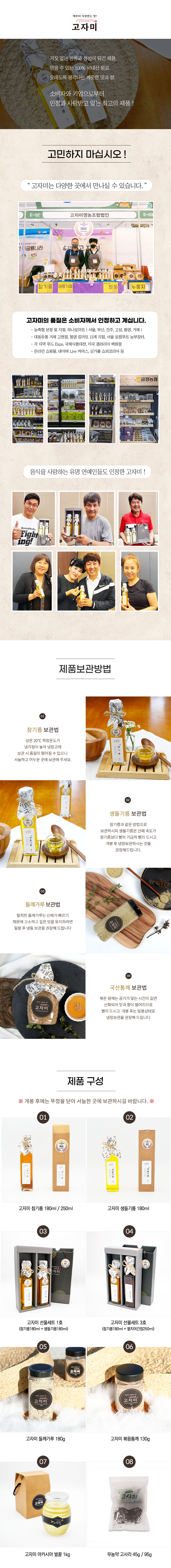 고자미 영농조합에서 제조하는 참기름은 지역에서 생산되는 100% 국산 참깨 사용, 첨가물 없이 저온압착방식으로 착유하여 맛과 향이 오래 보존되며, 벤조피렌이 검출되지 않는 건강하고 신선한 기름입니다.